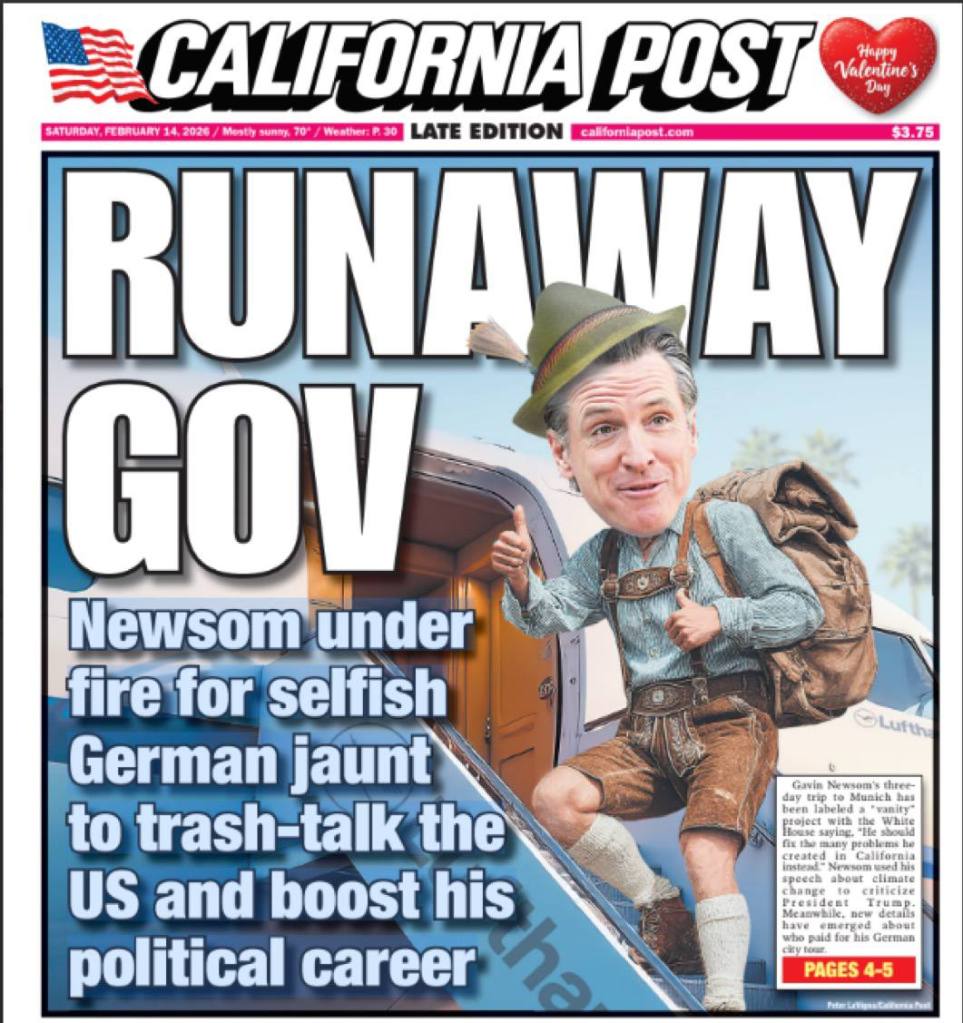 Besonders biederte Newsom sich offenbar beim deutschen Kanzlerdarsteller Friedrich Merz an, was prompt dazu führte, dass man ihn daheim in California mit einem Meme verspottet, wo er in Lederhosen und Gamsbart-Hut, Schuhplattler tanzend, lächerlicher gemacht wurde, als er ohnehin schon ist: